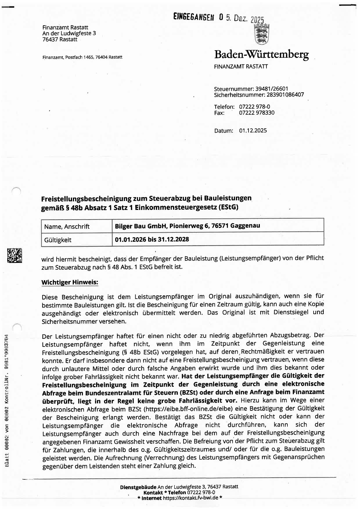 Benötigen Sie eine Freistellungsbescheinigung gemäß § 48b Abs1 Satz 1 EstG so können Sie diese hier einsehen bzw. downloaden.